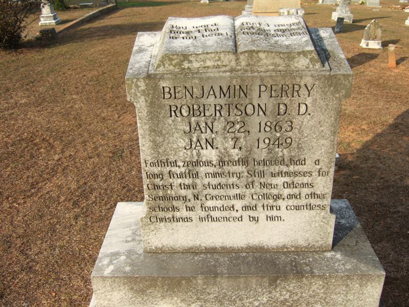 “Faithful, zealous, greatly beloved, had a long fruitful ministry. Still witnesses for Christ thru students of New Orleans Baptist Seminary, N. Greenville College, and other schools he founded, and thru countless Christians influenced by him.” – Dr. Robertson’s tombstone