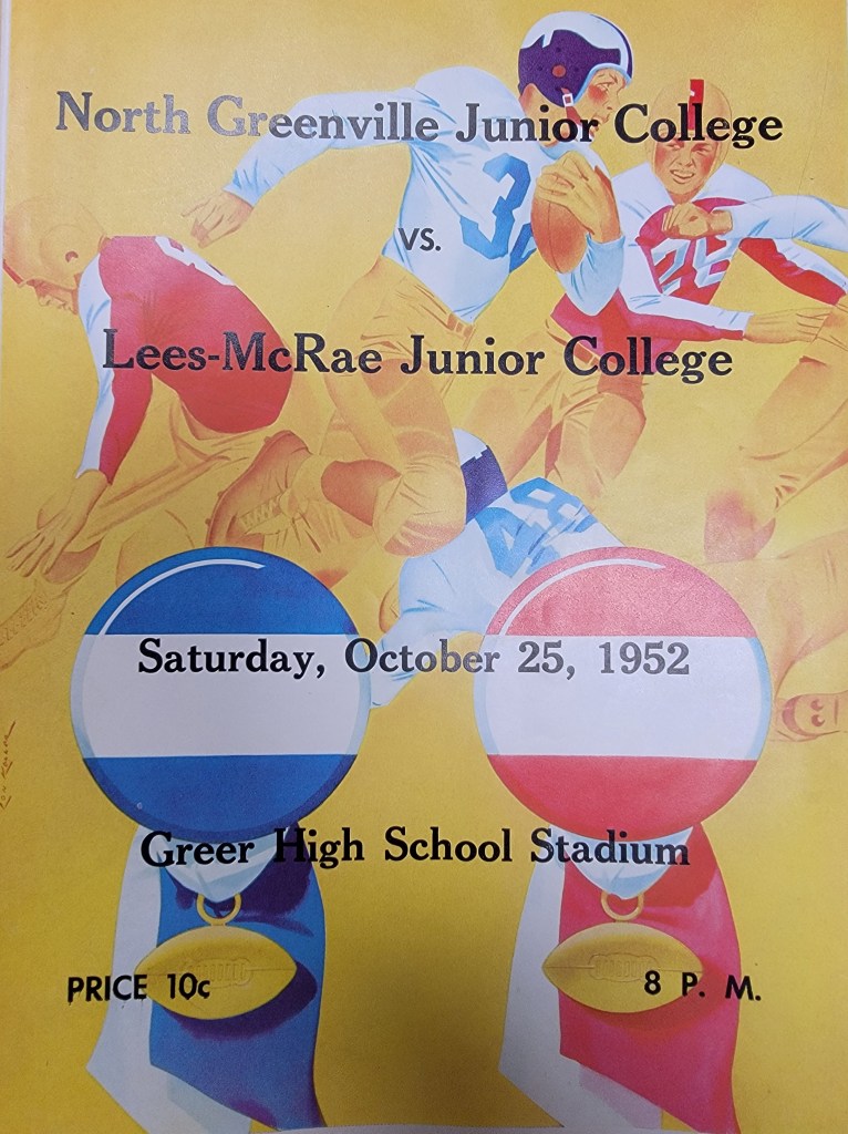 1949 saw the quiet return of North Greenville Football and the first college team to take the field in the school’s history. The new football team was called “The Black Widows”, they were coached by Charles Bruce, and the only game we have a record of from that first season is a win against Limestone 14-0. It was expected that players who needed more coursework to get into Furman would come to North Greenville first and earn their credits while playing football. In 1950, Walter Pinson, the coach of Greer High School, was hired as NGJC’s new football coach and athletic director. The Black Widows played in the Carolina Junior College Conference this season and we only have a record of two games. NGJC lost to the Presbyterian College Freshman but defeated Brevard Jr. College.