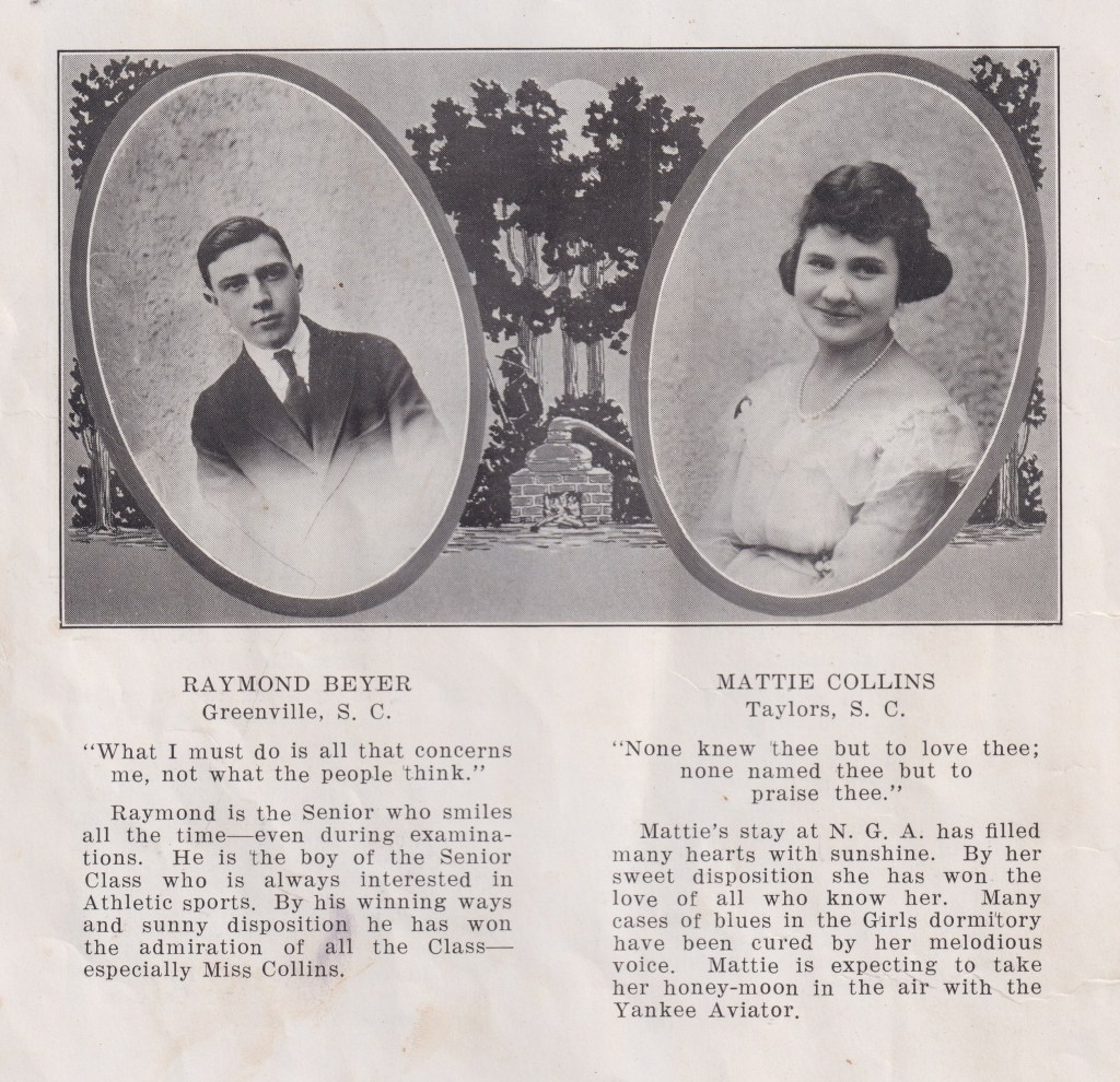 One of the most interesting alumni to attend North Greenville was Raymond H. Beyer. These stories usually start with the person’s time at North Greenville, but Raymond’s story starts earlier. He was born December 11, 1902 in Indiana to parents Herman Beyer and Bertha Hagedorn Beyer. From a very young age, Raymond filled his days with dreams of flying. He read H.G. Wells books, built wagons from scraps he found around town, and would pretend to fly using a broom handle with a makeshift propeller on it. At one point, he even jumped off a barn on his broom handle and ended up falling on a greenhouse instead of taking flight.
