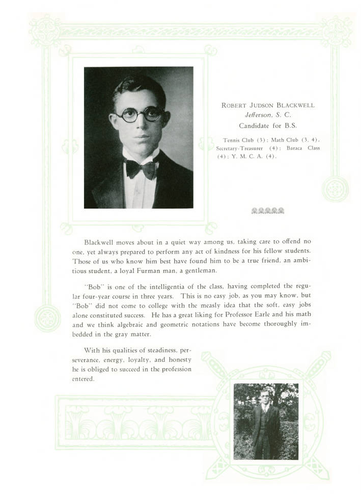 “Because of his sense of justice and devotion to duty, his efficient method of handling the job that is his, and his cheerful willingness to develop the untrained minds into skilled mathematicians, we, the staff, in grateful appreciation of his loyalty and interest in our Alma Mater, dedicate the 1947 Aurora to R.J. “Fess” Blackwell.” -The 1947 Aurora dedication page