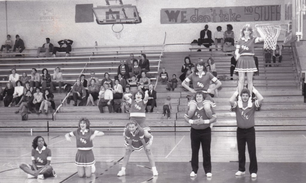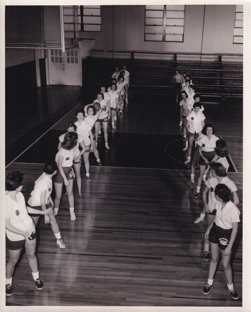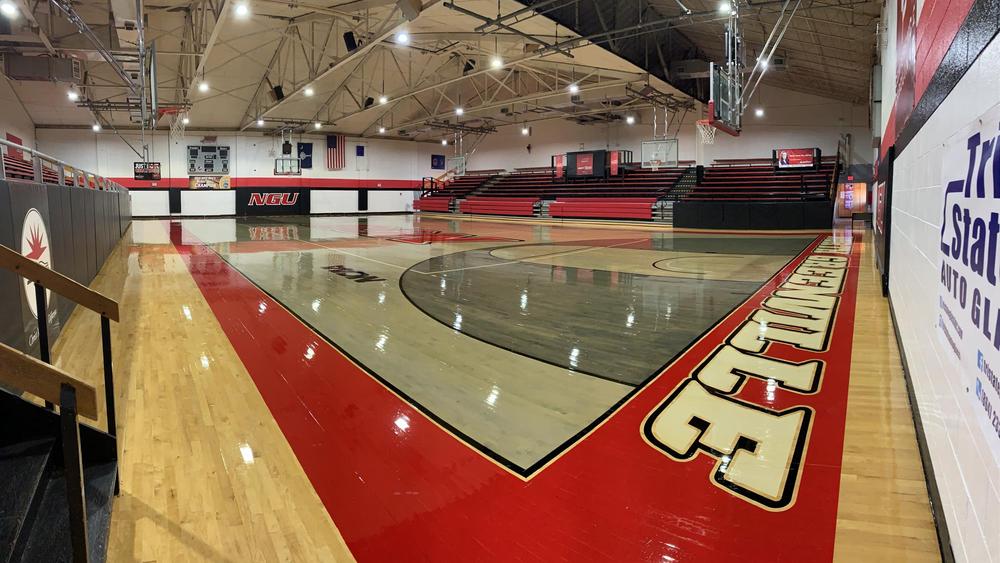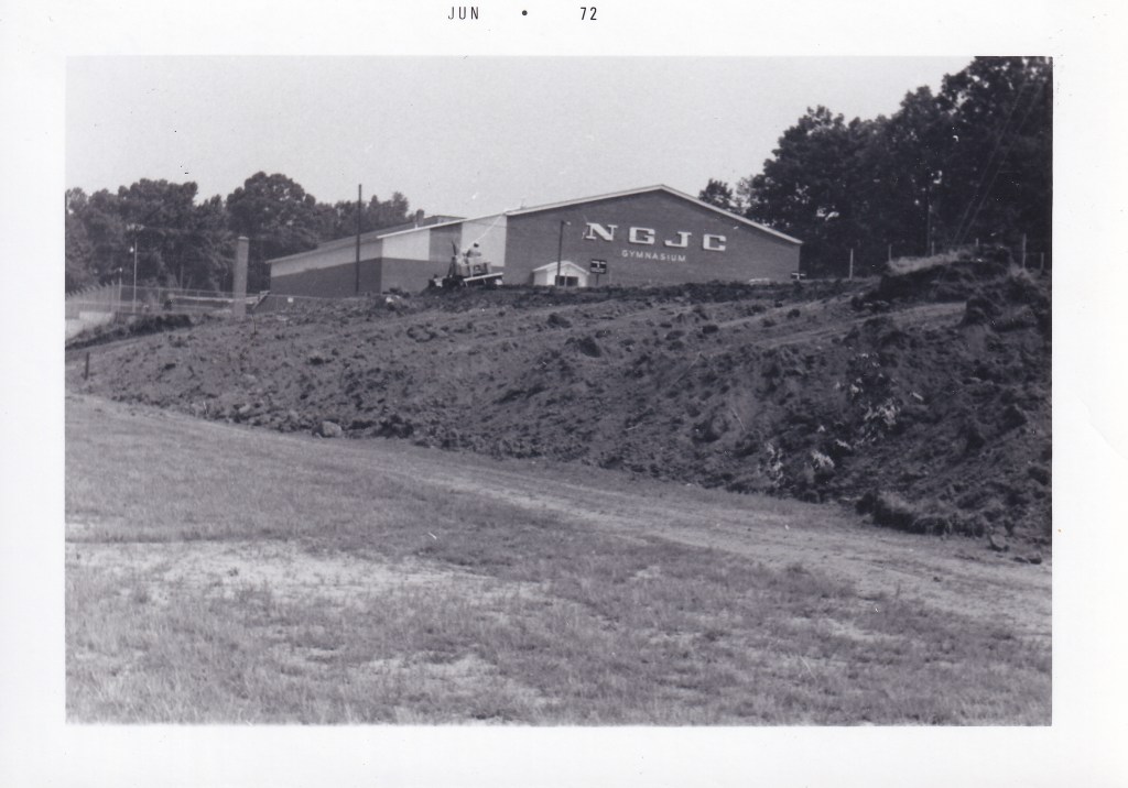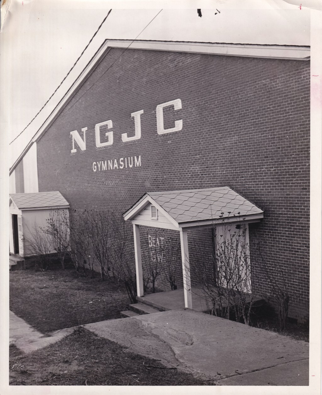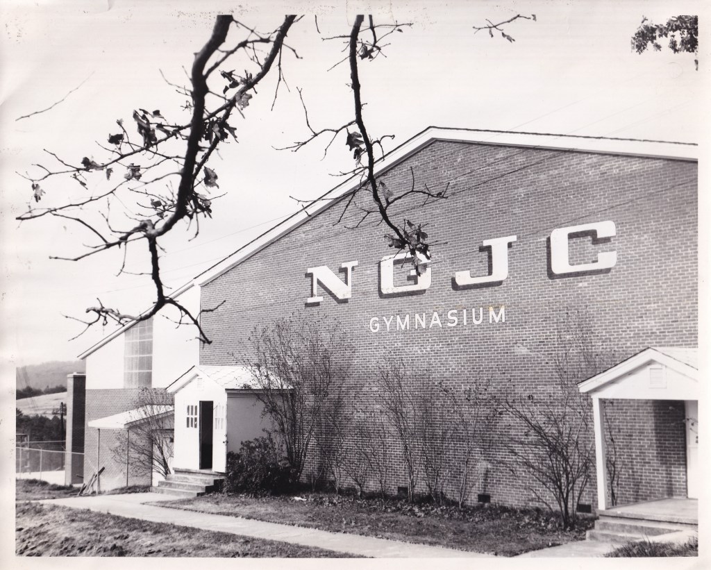 Throughout the early years, gym maintenance was often done by the students and coaches themselves. In 1953, for example, Coach Campbell had his men’s basketball team refinish the basketball court floors by hand using steel wool. Also in 1953, the school, partially using funds from the canteen, replaced the blackboard in the gym with a new electric score clock. In 1954, “N.G.J.C. GYMNASIUM” was painted across the main entrance of the gym and Grady Reece, the school carpenter, built another set of bleachers on the other side of the basketball court to provide extra seating. Previously, many fans had to stand at the games because there wasn’t enough room.