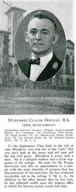 Dr. Murphree Claude Donnan passed away at the age of eighty-four on August 1, 1976. He is buried in the Tigerville Baptist Church cemetery where his gravestone faces the school to which he dedicated his entire career. His daughter, Lois, wrote about her father after his death, “His relationship with his family was one of warmth and love, for he was not a self-centered person but was always concerned with the needs of others. His love for his family, college students, and North Greenville College could not be expressed in words.”