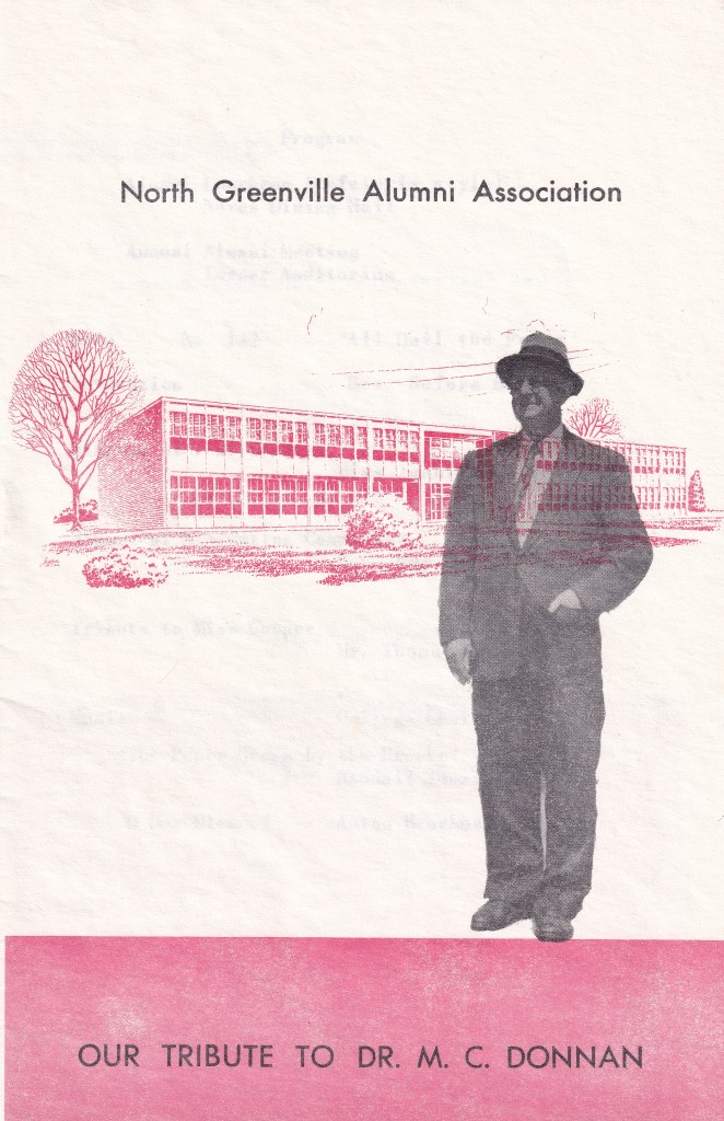 “For North Greenville Junior College, and for all the young people who pass through its doors, the dreams of one man are still being fulfilled. The quality of the man who dreamed them is shown in the fact that he always rejoiced in what others have done to aid North Greenville and make here a great Christian college just as much as he did in those things, he himself was able to do. Let me conclude this look at a man who did what he did because he was who he was by recalling a recollection of many times seeing him stand out there on the hill in front of the administration building. Not knowing he was observed he would gaze for long periods across the valley upon Glassy Mountain. I have wondered if he was testing his faith to see if he could move that mountain (for in his lifetime by faith he did indeed move many a mountain). Or was he being reminded of wherein his strength lay? ‘I will lift up mine eyes unto the hills from whence cometh my help; my help cometh from the Lord who made heaven and earth.’ A man may not be a giant among men but let him use his capacities as honestly and faithful as did President M.C. Donnan of North Greenville and countless individuals made better because of him will consider him truly great.” – Rev. Dr. Lloyd Batson
