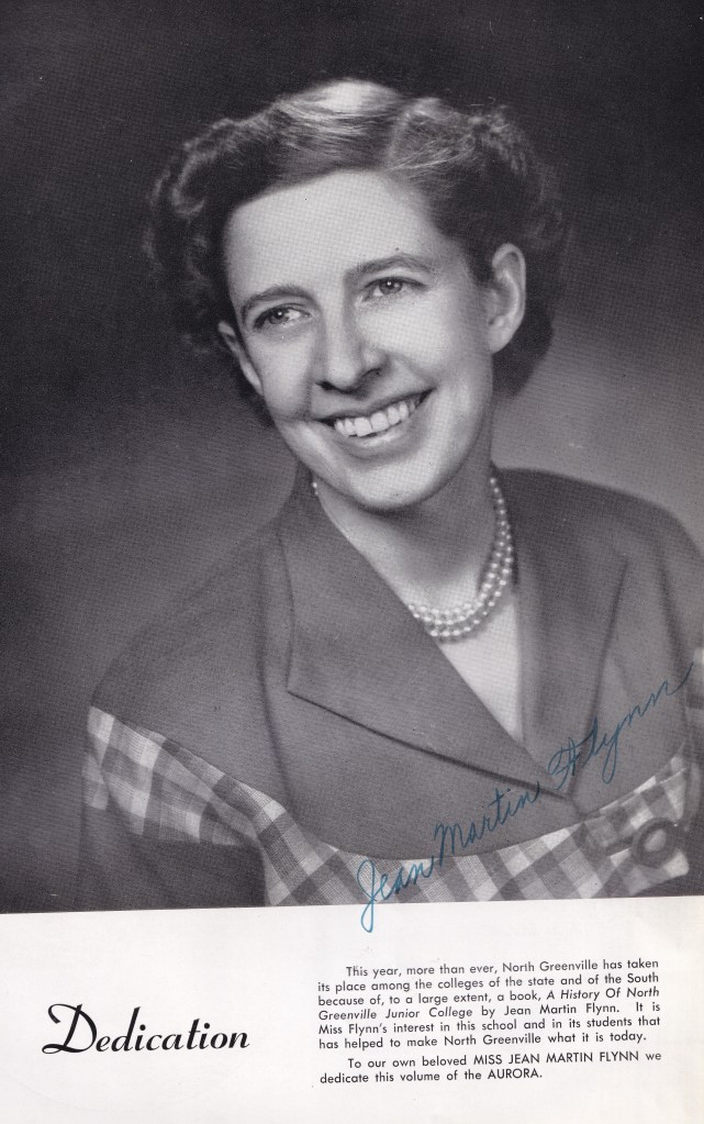 “This year, more than ever, North Greenville has taken its place among the colleges of the state and of the South because of, to a large extent, a book, ‘A History of North Greenville Junior College’, by Jean Martin Flynn. It is Miss Flynn’s interest in this school and in its students that has helped to make North Greenville what it is today.” – 1954 Aurora Yearbook Dedication Page