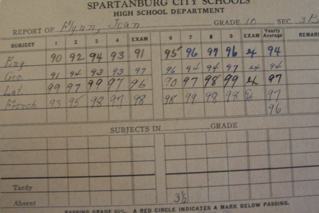 Jean Martin Flynn was born on July 11, 1917, to parents James Theron Flynn Sr. and Jennie Woodside Flynn. Her father owned a store in Easley, South Carolina named “J. Theron Flynn’s Store” where Wingard Jewelers is today on Main Street. Her mother was a school principal and teacher. Eventually, the family moved to the Chick Springs area of Taylors, South Carolina where Mr. Flynn was from originally. From a young age, Ms. Flynn excelled in school. Her mother taught Ms. Flynn and her siblings the body parts in Latin and education was a priority for the family. She attended Taylors High School before the family moved to Spartanburg and she then attended Spartanburg City High School. During her high school years, she won awards in writing and oration and participated in plays. She attended college at Winthrop where she was a member of both the Beta Pi Theta National Honorary Society for French students and the Eta Sigma Phi National Honorary Society for Latin students. She graduated with honors from Winthrop in 1938 and began a career in teaching that fall.