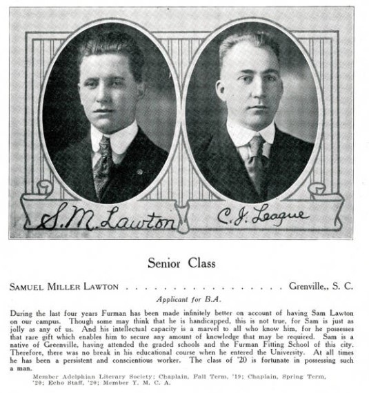 “Among Mr. Lawton’s most valued characteristics are his steadfast refusal to be discouraged, his persistence, his determination, his genuine appreciation of deep spiritual values, and his constant sense of humor which has served him and his colleagues well in tiding over many a discouraging situation.” – The Greenville News, May 28, 1939