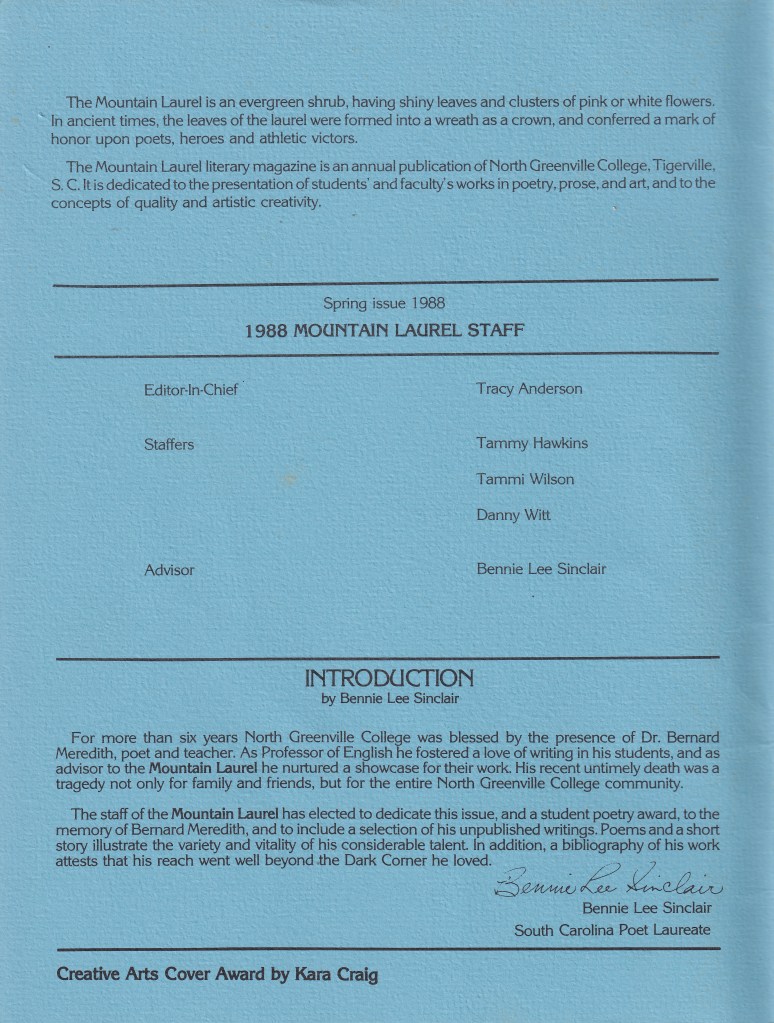 When Dr. Meredith arrived at North Greenville, he discovered that the school’s literary magazine, The Mountain Laurel, had not been published in two years. One of the first things he did at North Greenville was to revive The Mountain Laurel by putting out a call for submissions in the fall of 1980. His work was successful and The Mountain Laurel was once again printed that spring. The Mountain Laurel has been published continuously since its 1981 revival. 1981 was also the year that Dr. Meredith published his book “Signing” which received the Winthrop College Chapbook Award in Poetry.