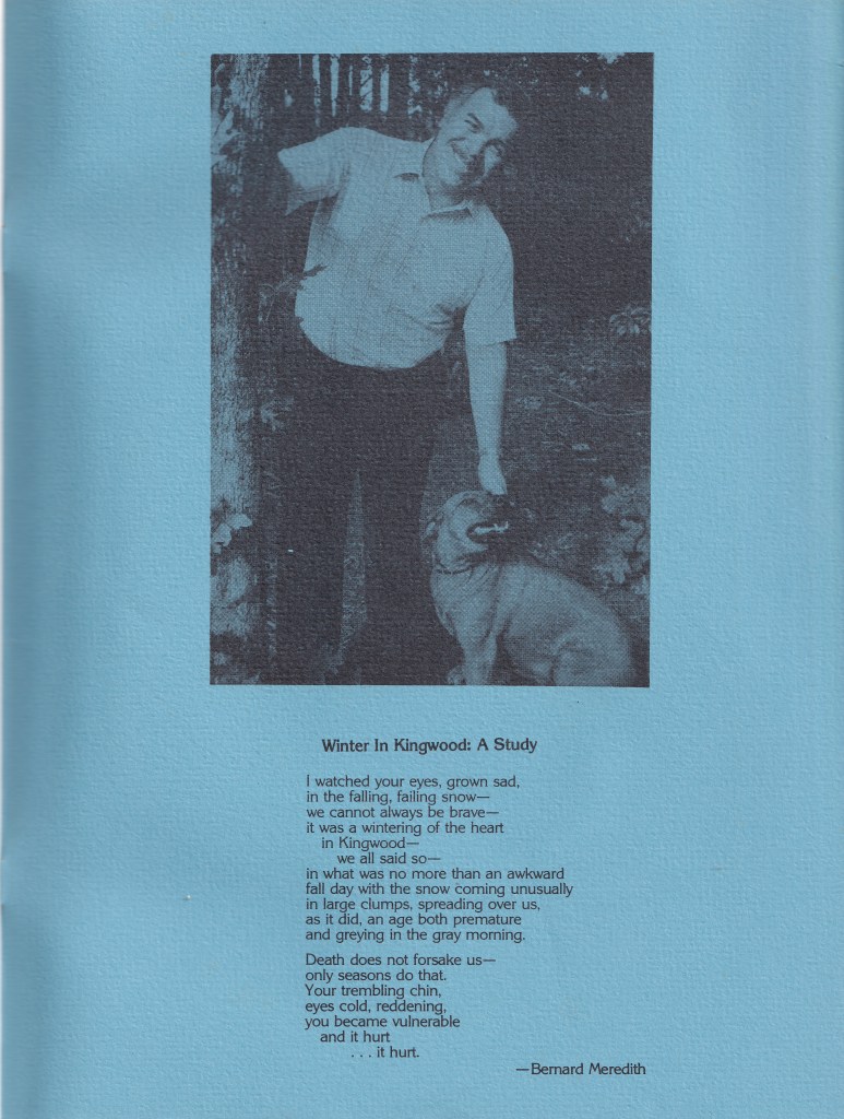 After completing his master’s degree, Bernard accepted a position as a professor of English at West Liberty State College (WLSC). While teaching at WLSC, Bernard enrolled in the American Literature Ph.D. program at West Virginia University. His dissertation was, “The Autobiographical Image in the Poetry of James Wright” and he completed his Ph.D. in 1979 with a 4.0 GPA. In 1976, he became a tenured professor at West Liberty State College, and in 1977 he was published in the book “From the Branches” with two other poets. From 1978-1980, Dr. Meredith served as the faculty advisor for WLSC’s literary magazine, “Ampersand”.