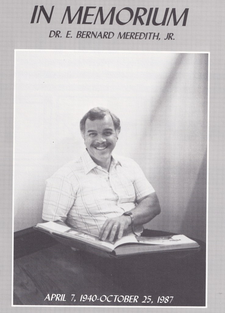 The North Greenville campus was shocked by the sudden death of a beloved professor. The 1988 Mountain Laurel was dedicated to Dr. Meredith, the 1988 Aurora yearbook included a memorium, and several North Greenville faculty members participated in his memorial service. North Greenville’s Senior Assistant VP of Operations, Billy Watson, had Dr. Meredith as a professor when he attended North Greenville as a student. He said of Dr. Meredith, “He told great stories and was very encouraging. I remember I wrote an essay and he told me it was excellent but my handwriting was awful. It was about a football offensive lineman I tried to emulate, John Hannah. Dr. Meredith said it was the best laid-out paper he had all year. His encouragement made me want to do well academically. He was, in general, very smart, kind, and a really good man.”