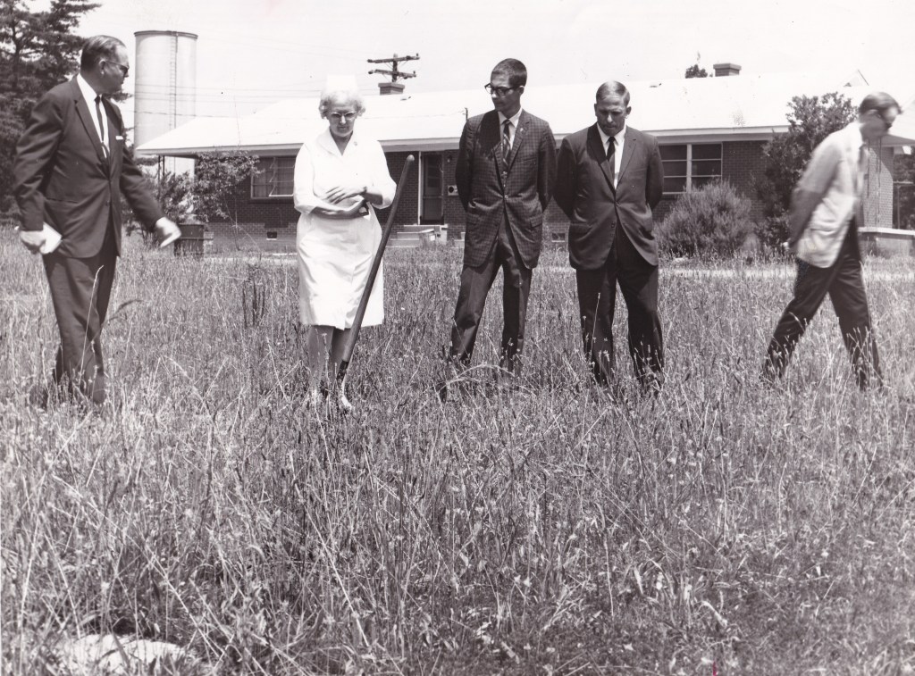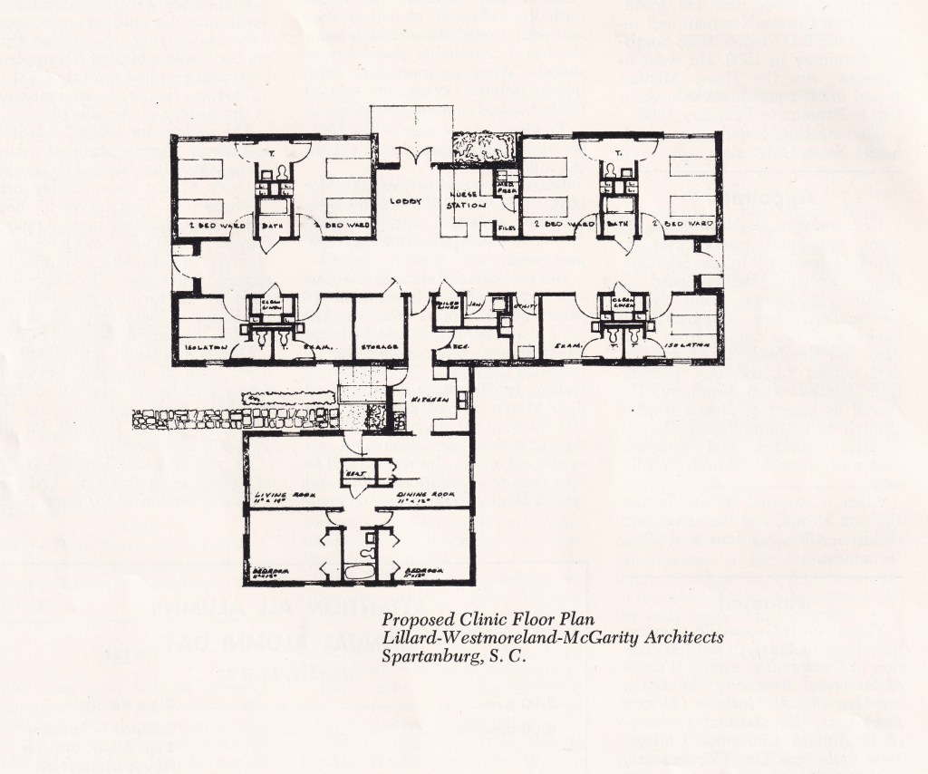 Nurse Clayton used the auditorium space to treat the campus community until 1966 when plans were put into place to build a new clinic. The groundbreaking ceremony was held June 13, 1966, with construction beginning the next day. Nurse Clayton participated in the groundbreaking ceremony and was the first nurse to occupy the new clinic. Foster Construction Company of Greenville was chosen to build the design made by Lillard, Westmoreland, and McGarity Architects of Spartanburg.
