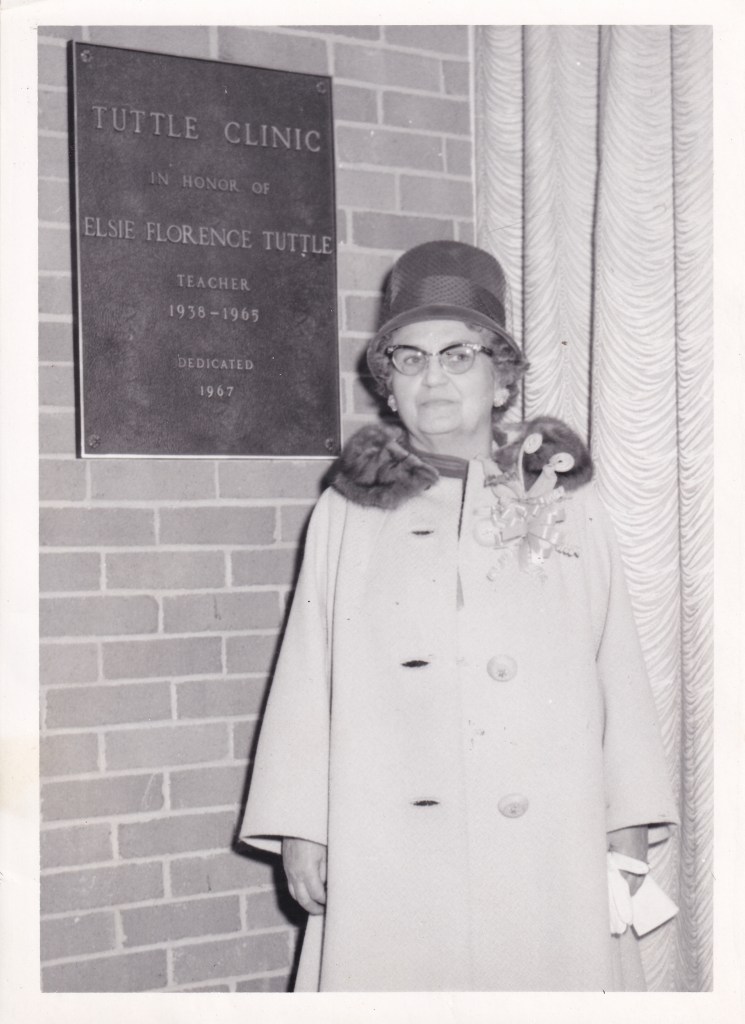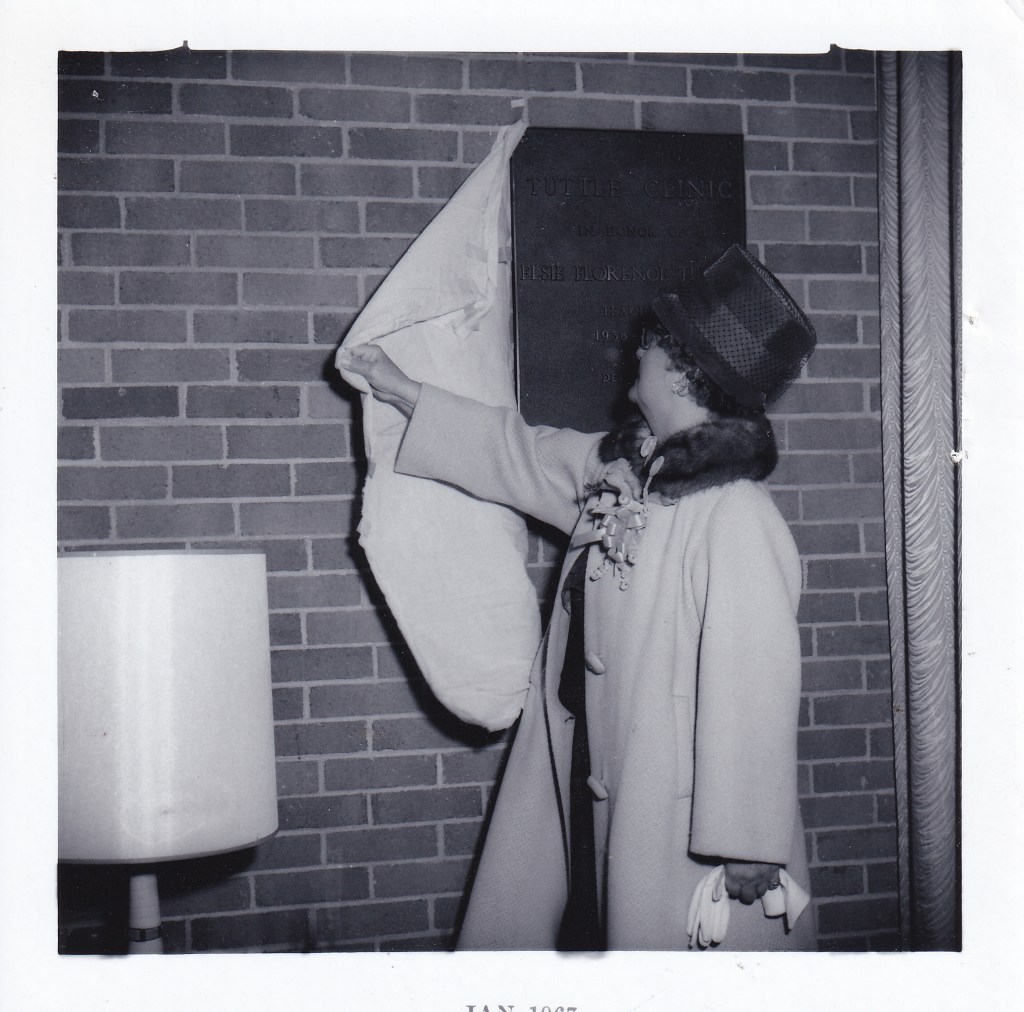 The dedication service was held in January 1967. The clinic was named Tuttle Clinic in honor of Elsie Tuttle who was an instructor at North Greenville from 1938-1965. Miss Tuttle taught various subjects including geology, geography, sociology, and government. In addition to teaching, Miss Tuttle was the faculty sponsor of the Sociology Club, the Honorary Social Science Society (later called Sigma Tau Sigma), and organized the World Wide Interest Club. Miss Tuttle attended the dedication service and unveiled the plaque featuring her name and dates of service.