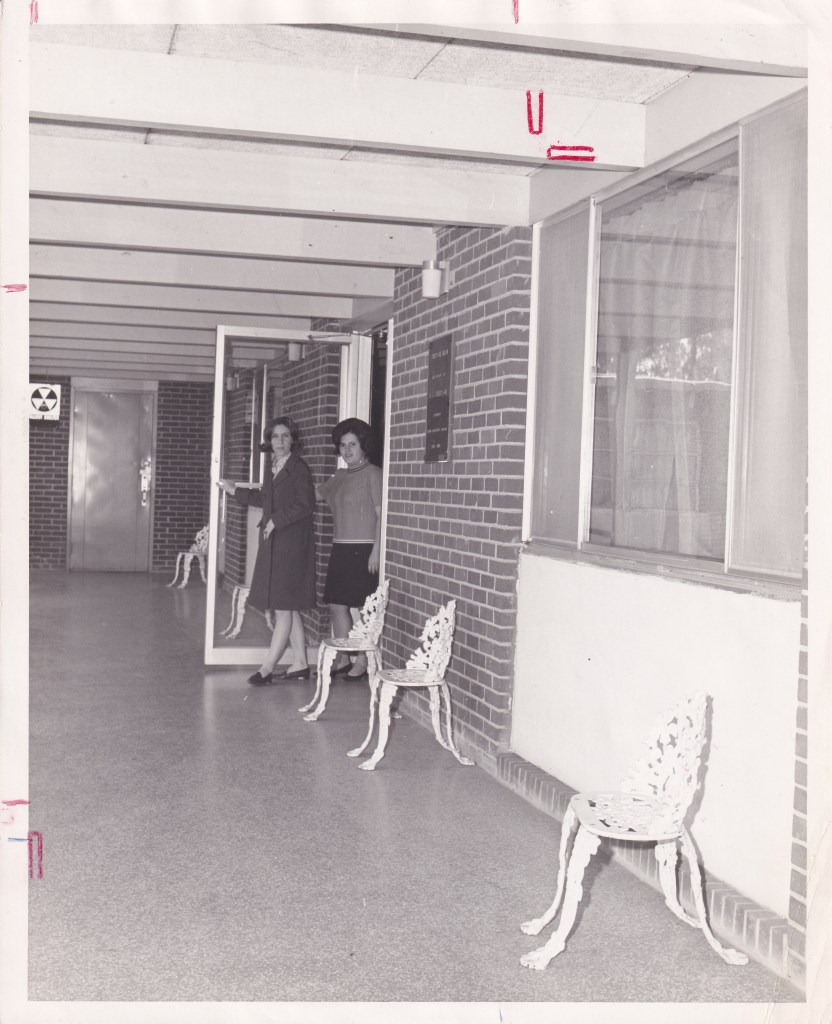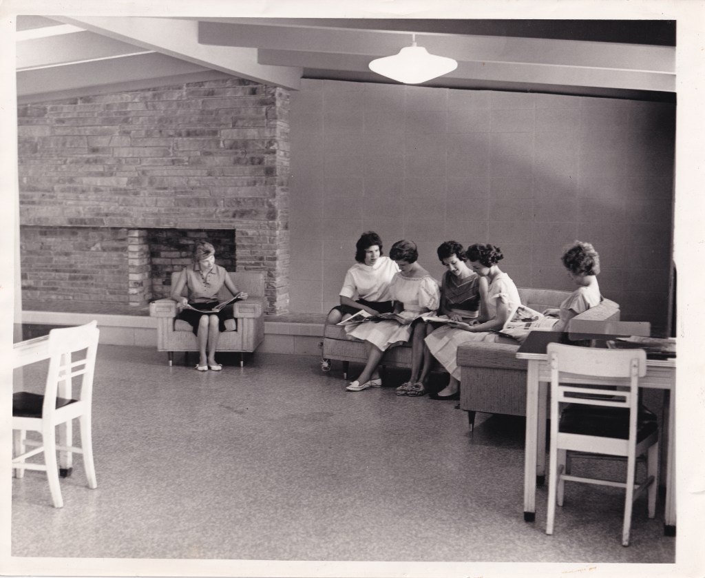 The first 56 women moved into the newly completed dorm on February 10, 1961. The last bit of plumbing and electricity was completed that morning. The women who moved into the new dorm had been temporarily staying in Taylor Hall, a former men’s dorm. The dorm rooms were suite-style with two rooms sharing a bathroom in-between. Each room had space for two students.