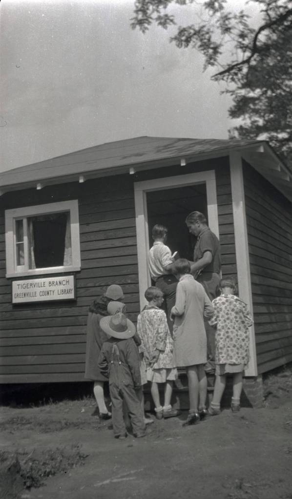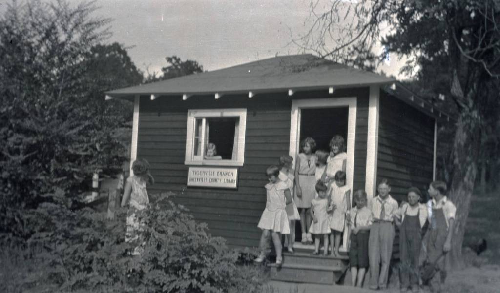 Before the 1930s, anyone who wanted to visit a library in northern Greenville County had to travel to Greenville. Eventually, the Greenville County Library started to bring book trucks out to Tigerville. The community response was so great that the library system decided to build a small library branch in the town in 1930. The roads to Tigerville were in bad condition so constructing a physical building would be easier than continuing to travel with a book truck. The total cost of the building project was between $80-$200 and the location chosen was on the corner of the Tigerville Elementary School property. At the time, Tigerville Elementary School was located across from present-day Tigerville Baptist Church in the building where the North Greenville University Honors House is today. Grady Reese, a longtime North Greenville carpenter, built the library with a contractor named John McKinney. The new library was a roughly 12×14 foot square building painted red with white trim. Mr. Reese later said that when the woman from the library came to pay them for their work she declared, “That is the prettiest little thing I ever did see!”