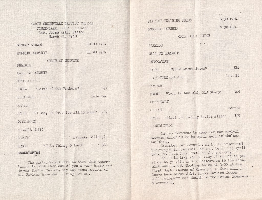 The first service in the new church building was held on February 24, 1963, and a dedication service took place on April 7 of the same year. H.J. Howard, who was the Tigerville Baptist Church historian and the dean of North Greenville Junior College, wrote in the dedication program, “As we contemplate the noble ideals and the sacrificial spirit of those who have labored to bring us to this period of history of our church, and as we survey the heights that have been reached and the goals yet to be attained, let us give thanks for the blessings of this day and pray that our church may strive for spiritual heights comparable with the physical facilities with which our Lord has seen fit to entrust us.”