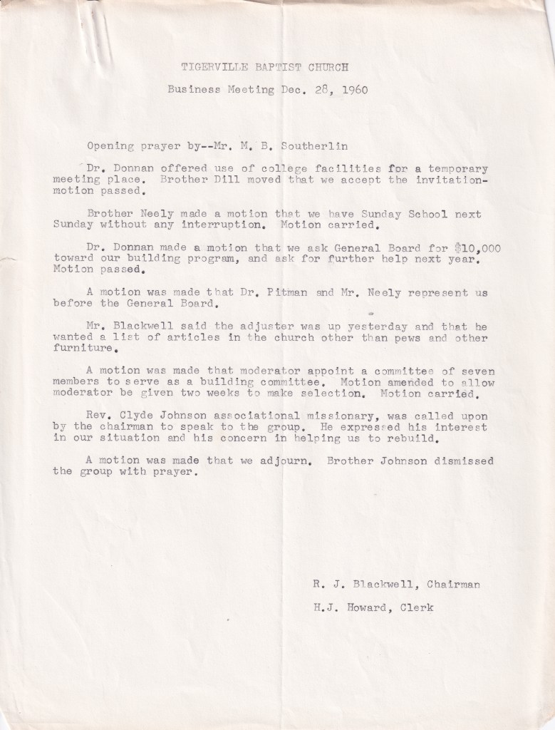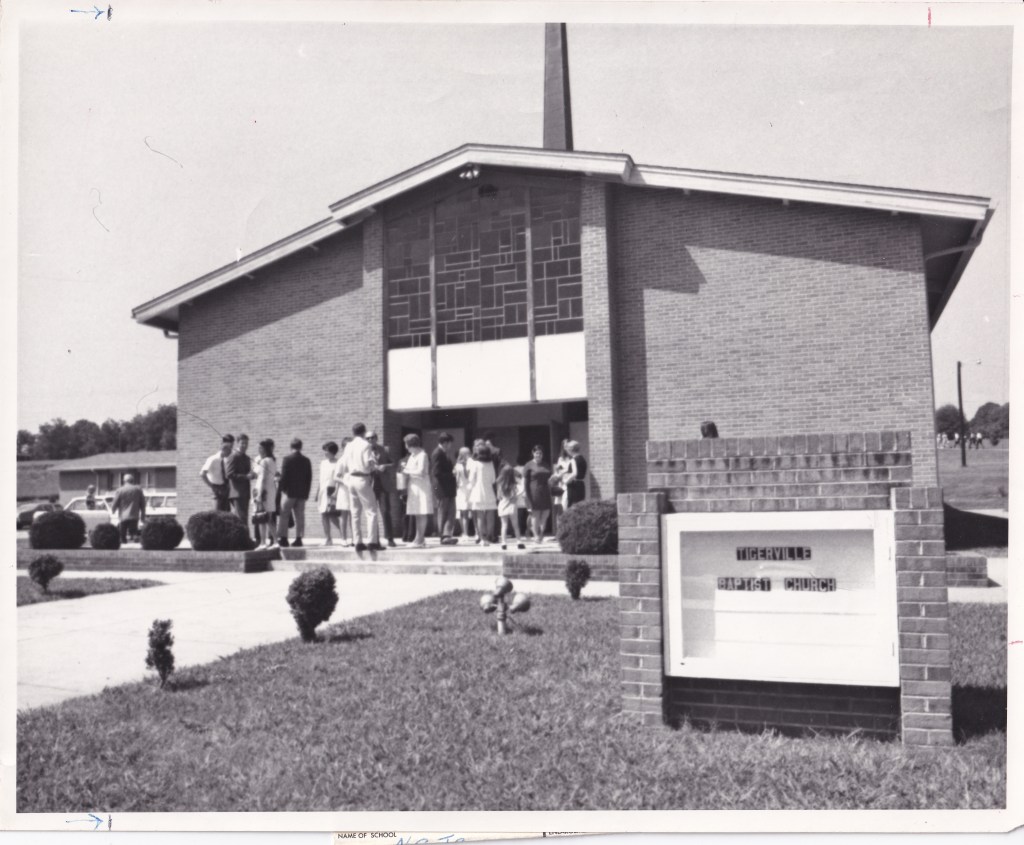 By the time construction began on the church building, Rev. Gillespie had resigned, and the new pastor was Rev. Jesse M. Hill. Financing a church building with a membership made up of largely college students proved to be difficult and took considerable time. In fact, 25% of the funds for the project came from the South Carolina Baptist Convention and friends of church members. Despite the obstacles, the church building was completed, and the first services were held in the new building in the spring of 1948. Once the church moved into their own building, membership began to rise as more community members felt comfortable joining. It was at this time that the name of the church was changed from North Greenville Baptist Church to Tigerville Baptist Church to help distinguish it as its own separate entity from the school.