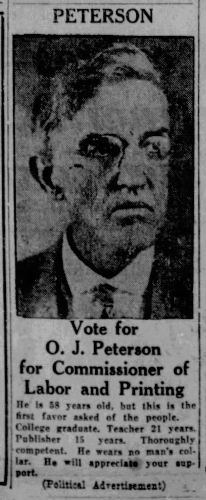 Soon after losing his first primary election attempt, Peterson made the decision to return to editorial work, and he purchased “The Chatham Recorder” in Pittsboro, North Carolina. His work at “The Chatham Recorder” was praised by other journalists, and an article in “The Raleigh Times” stated, “O.J. Peterson is so honest that sometimes we feel inclined to bleed for him. But he carries on with the spirit of a man getting a great kick out of a hard but well loved job.”